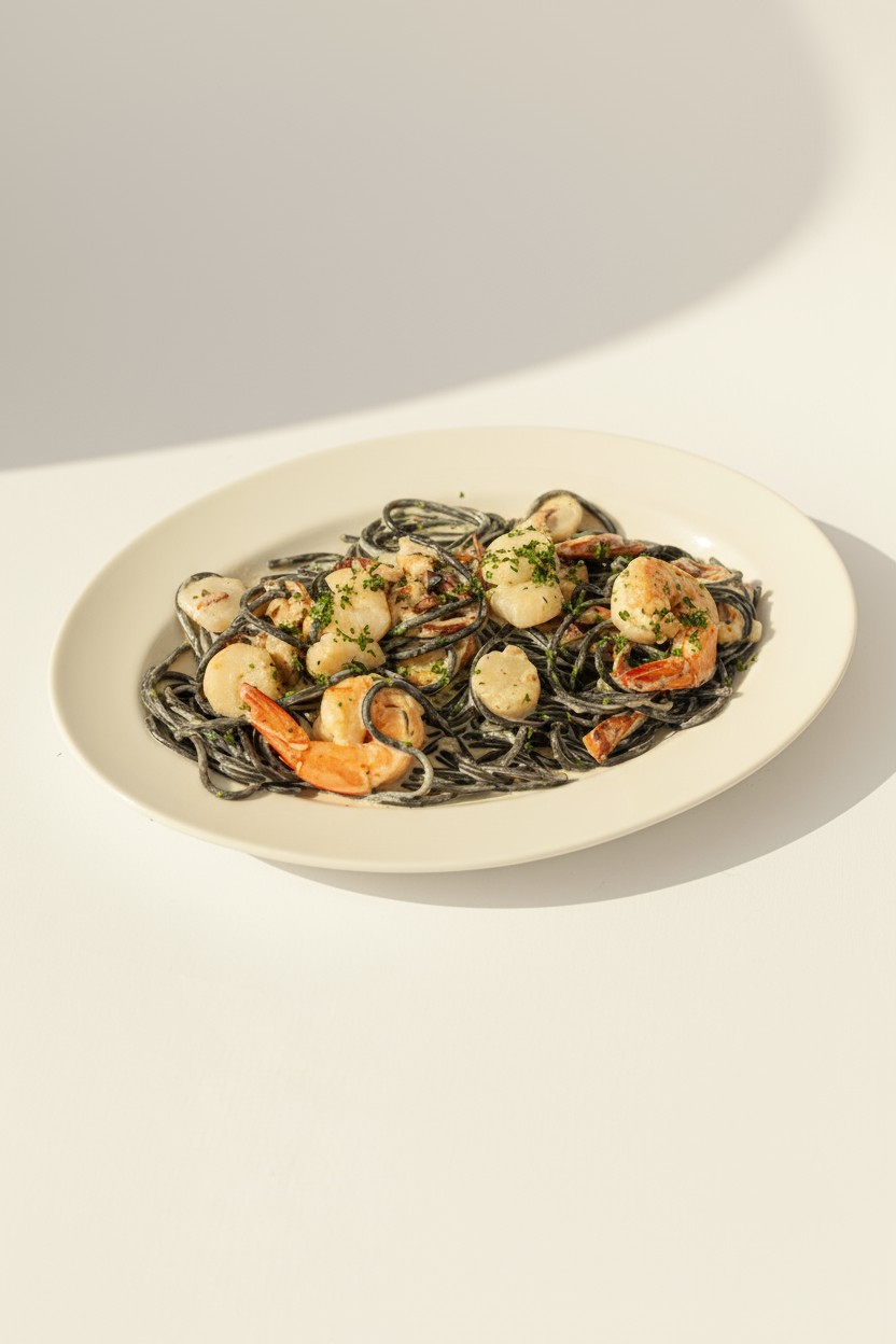Squid ink pasta with scallops and brown butter sea salt sauce