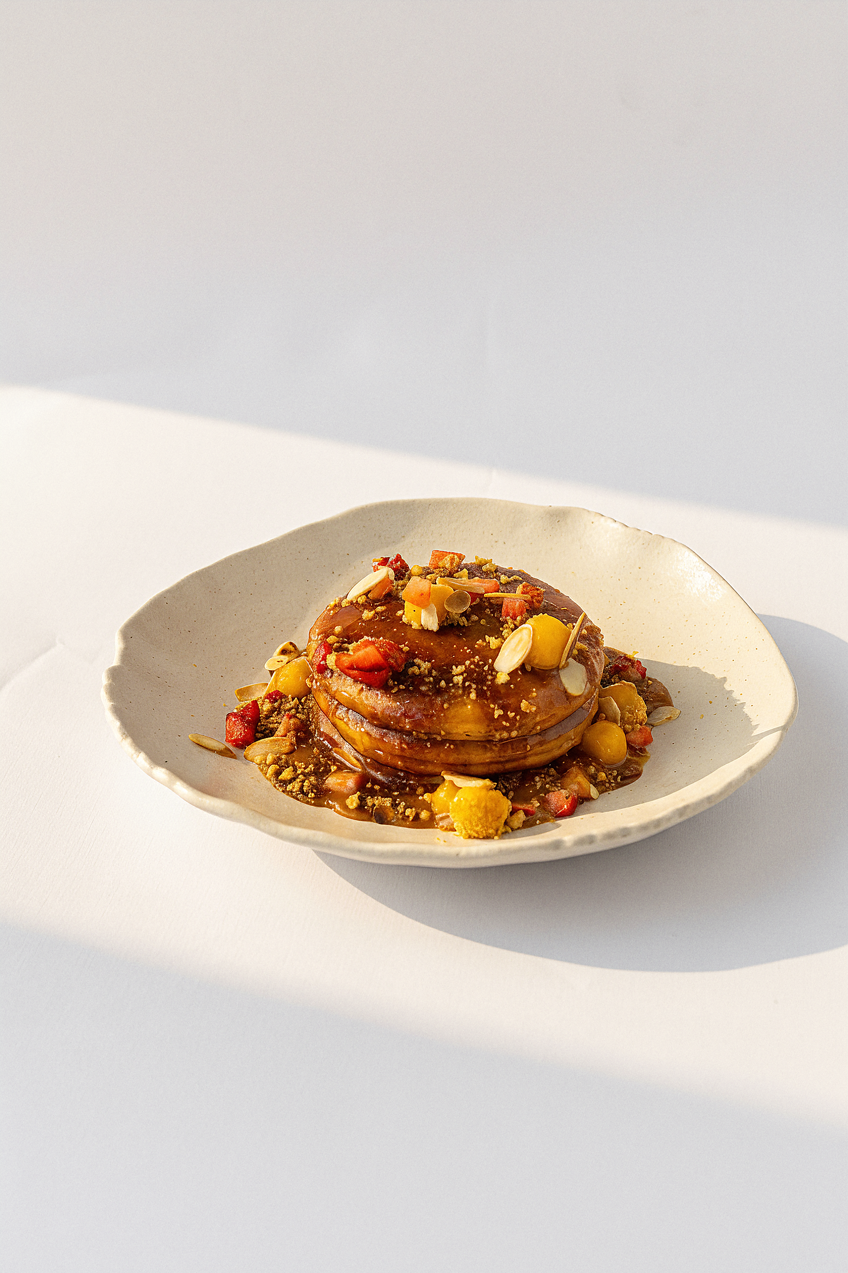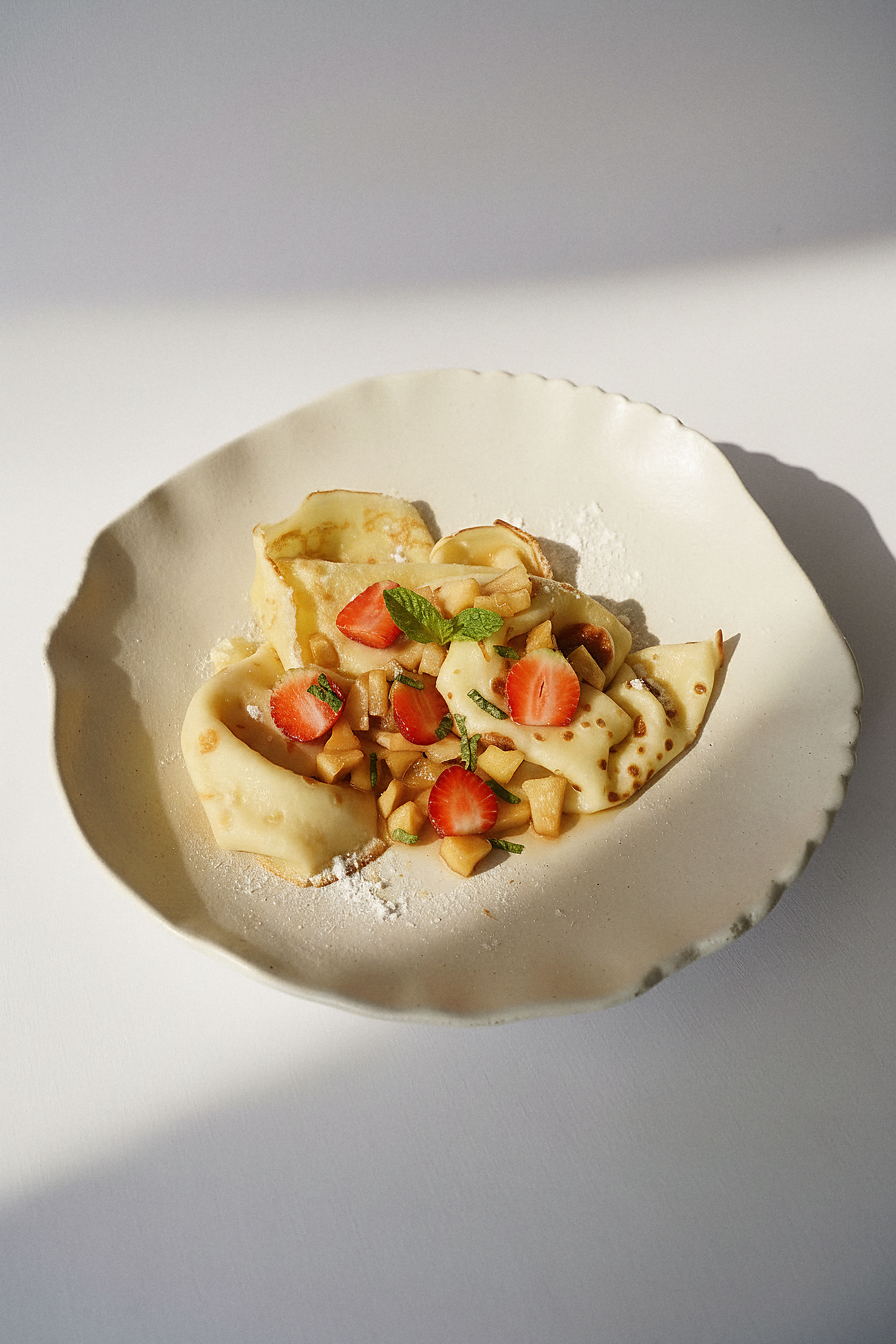Crepes with caramelized apple, cinnamon & fresh strawberries