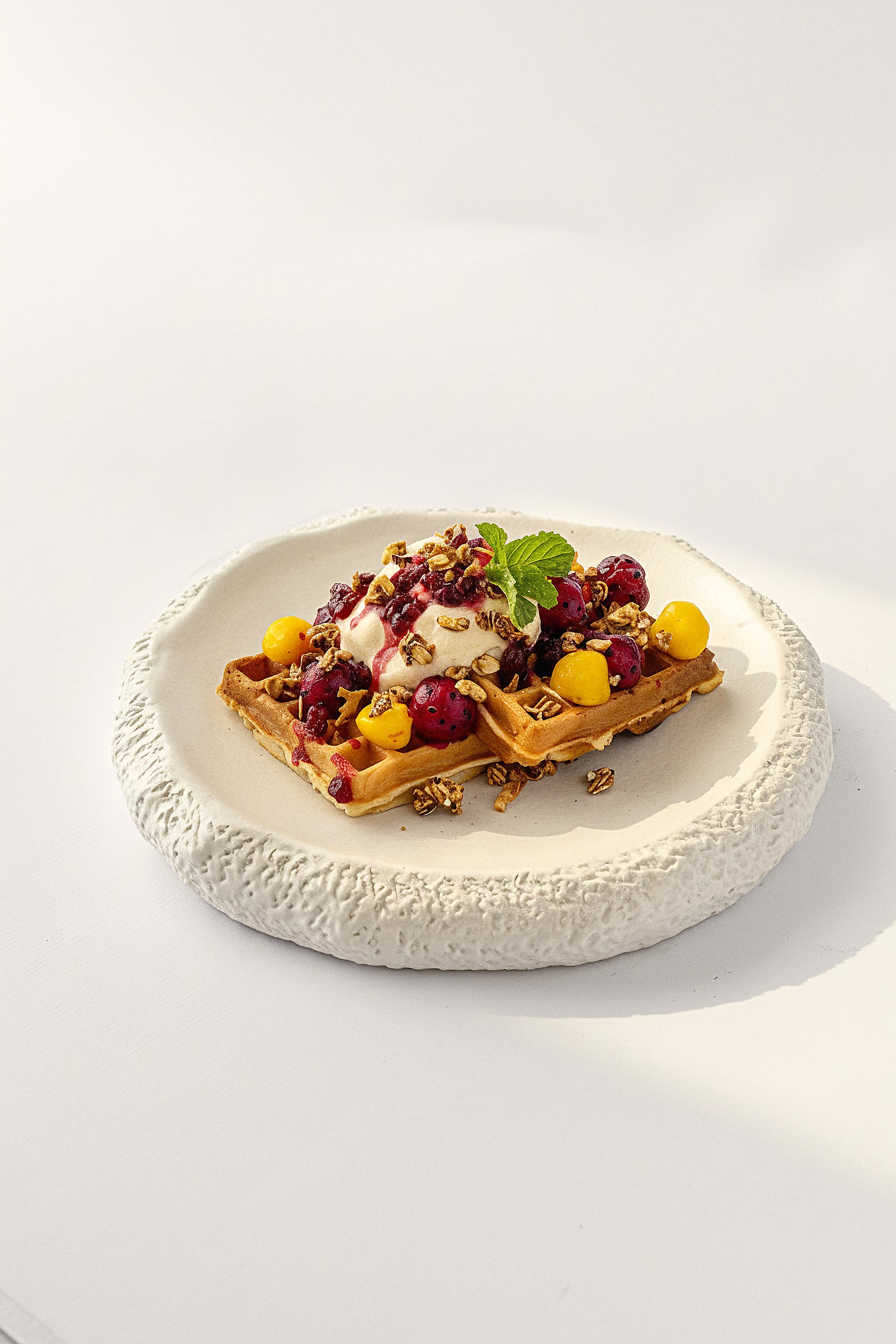 Belgian waffle with whipped cream, cranberry sauce & fresh fruits