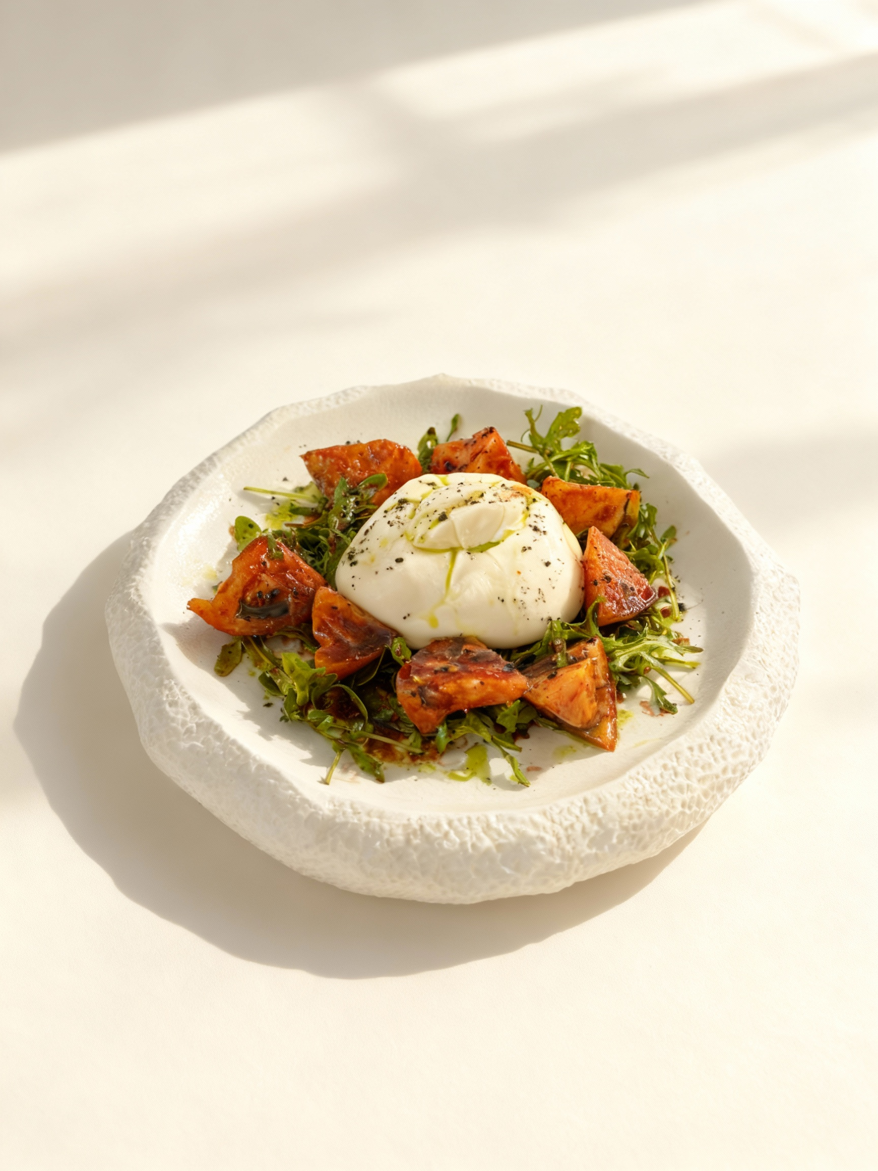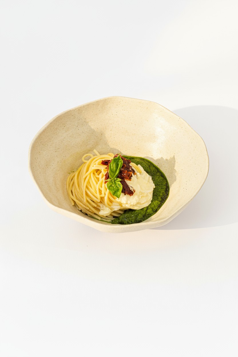Pesto pasta with stracciatella & sun-dried tomatoes